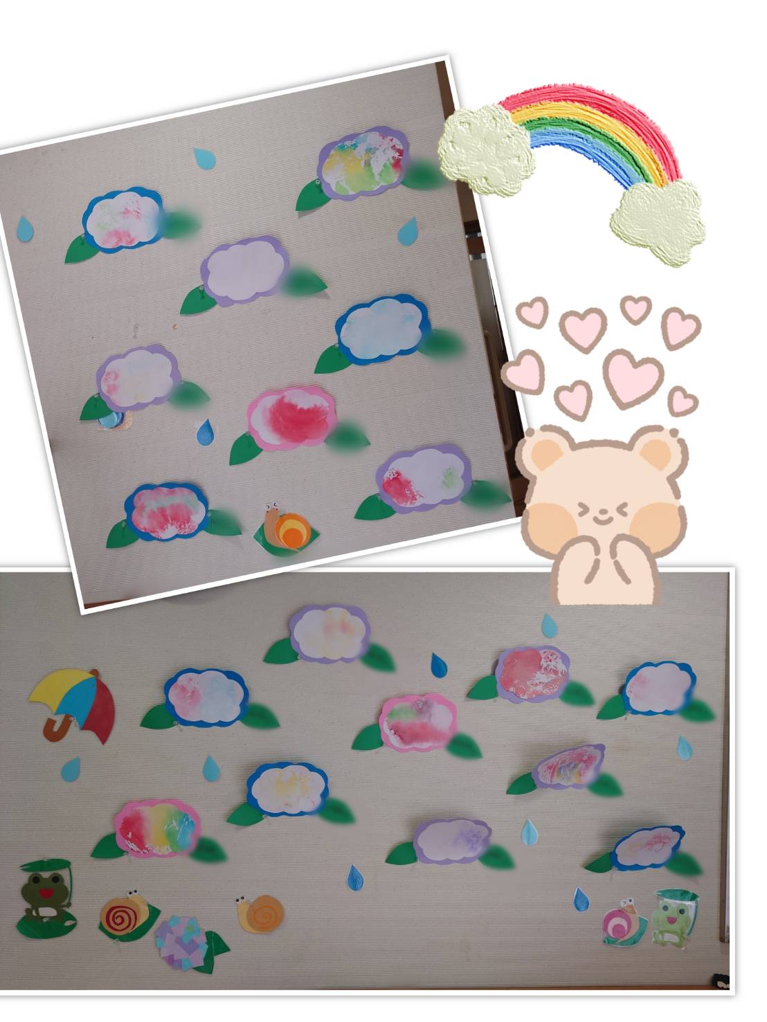 今月の壁面 《けあぽーと》 ここんにちは けあぽーとです。 今年の梅雨はあっという間に終わってしまいましたが、けあぽーとの玄関は紫陽花が満開です😄 どうやったらキレイに色が出るのか、考えながら作りました👍�