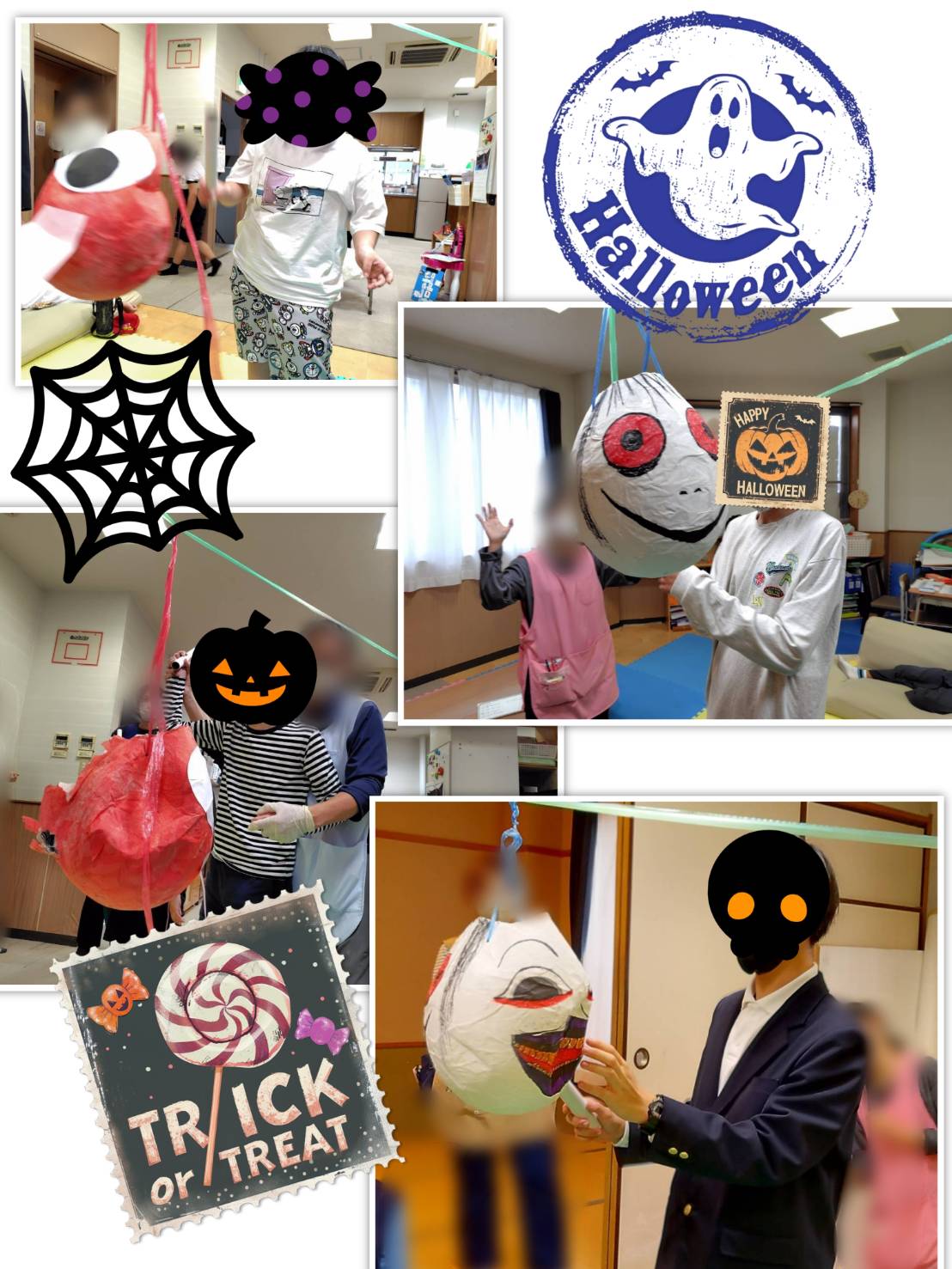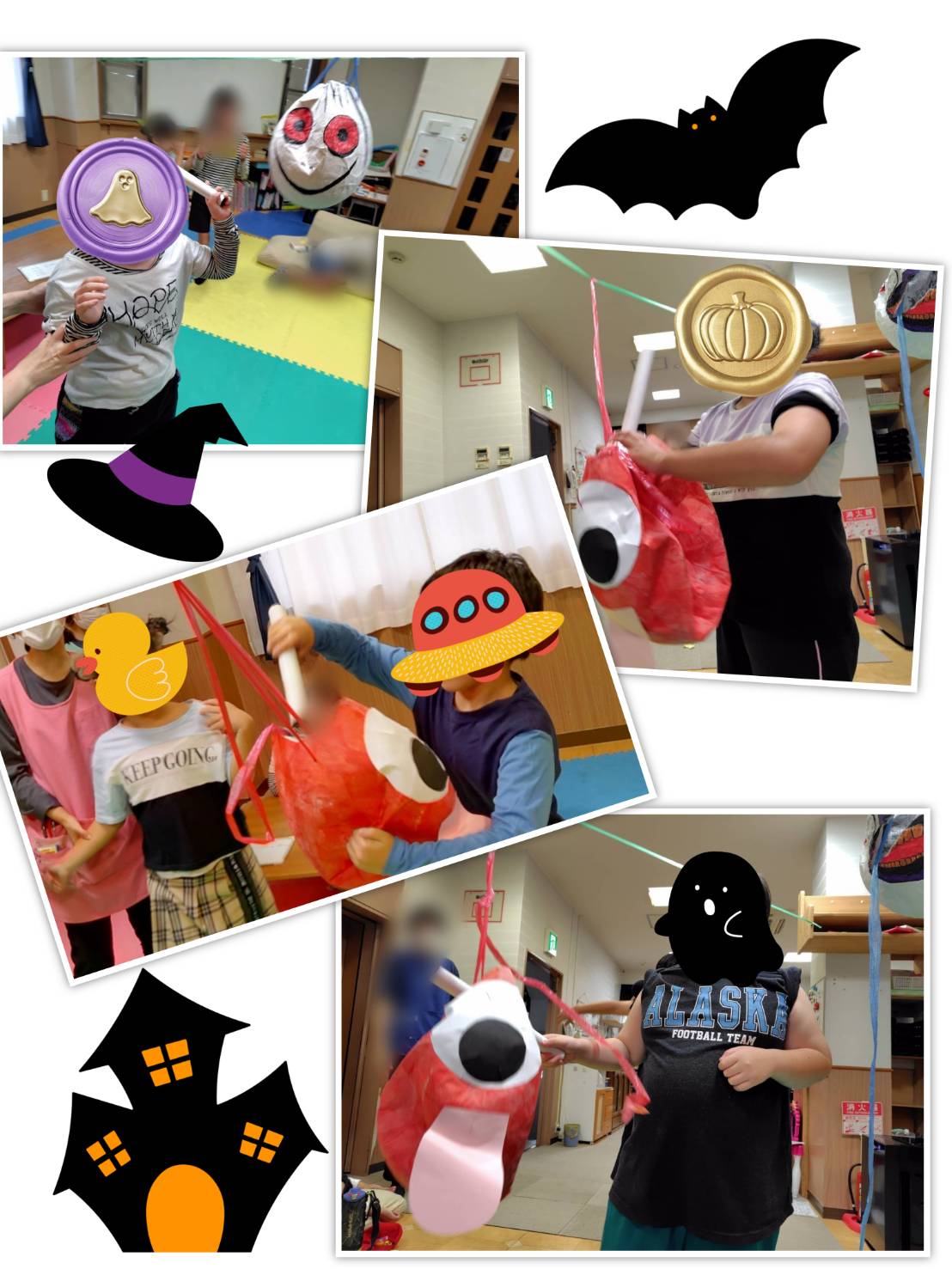 ハロウィンイベント《けあぽーと》 こんにちは、けあぽーとです。 今日は、イベントの時に紙で作られた型枠の中に菓子や玩具などを詰めて、上から吊るして棒で叩き割る遊び(ピニャータというそうです)を、ハロウィンイベントとして行いました。 職員の力作(こ、こわい…😱) 最初は遠慮がちに叩いていた子どもたちも、だんだんエキサイト‼️ 中身のお菓子はみんなで仲良く分けました😄