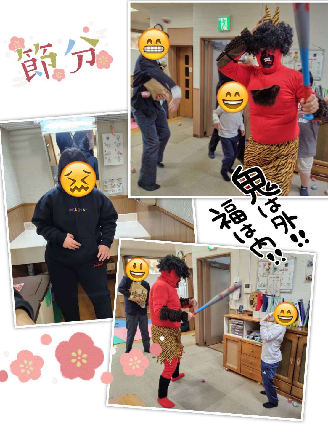 鬼だー! 《けあぽーと》 こんにちは、けあぽーとです。 今年も、節分前に赤鬼がやってきました👹 突然の鬼の登場にびっくりして、お部屋の端っこまで逃げちゃう子、果敢に鬼に向かっていく子など、反応は様々。 ですが、最後は力を合わせて豆(新聞ボール)を投げて、鬼(邪気)を追い払うことができました✨