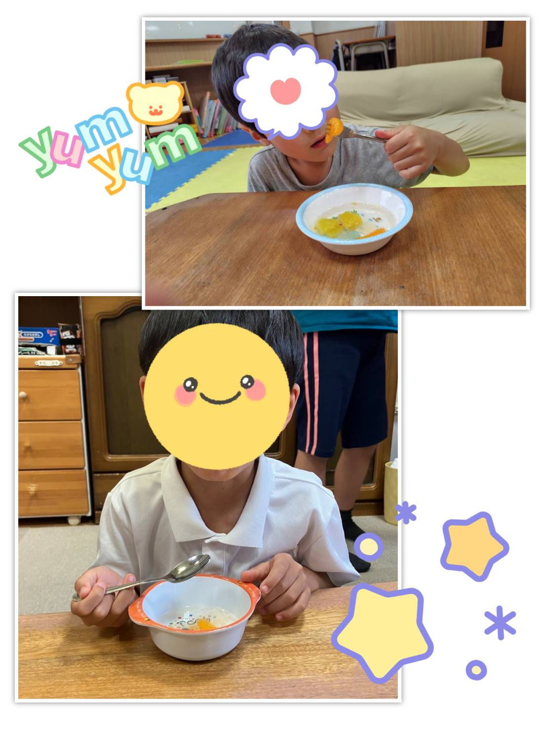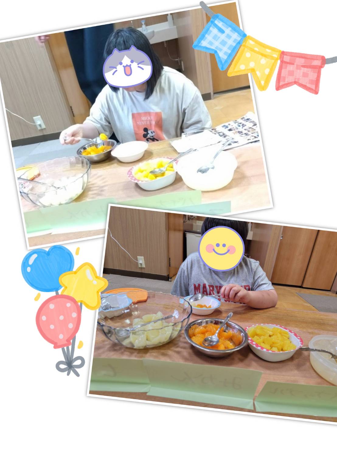 フルーツポンチ作りました《けあぽーと》 こんにちは。けあぽーとです。 午前中で学校が終わったので、今日はみんなで、フルーツポンチを作りました🍊 フルーツをカットします(刃のない包丁を使っています😊) 今日は自分で好みの量を盛り付けました😆 では、いただきま〜す🍴 順番を守って楽しく活動できました✨ 美味しかったね、また作ろうね👍