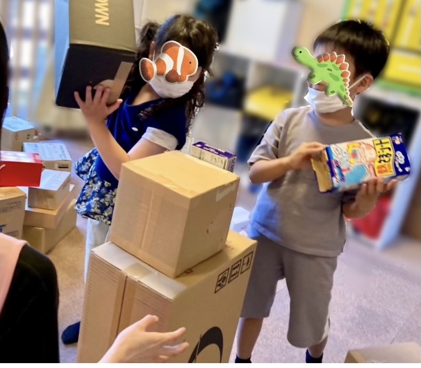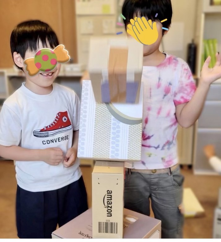 ダンボール箱やティッシュの空き箱などを使って思い思いに積み上げたり倒したり壁を作ったりあそびます☺️